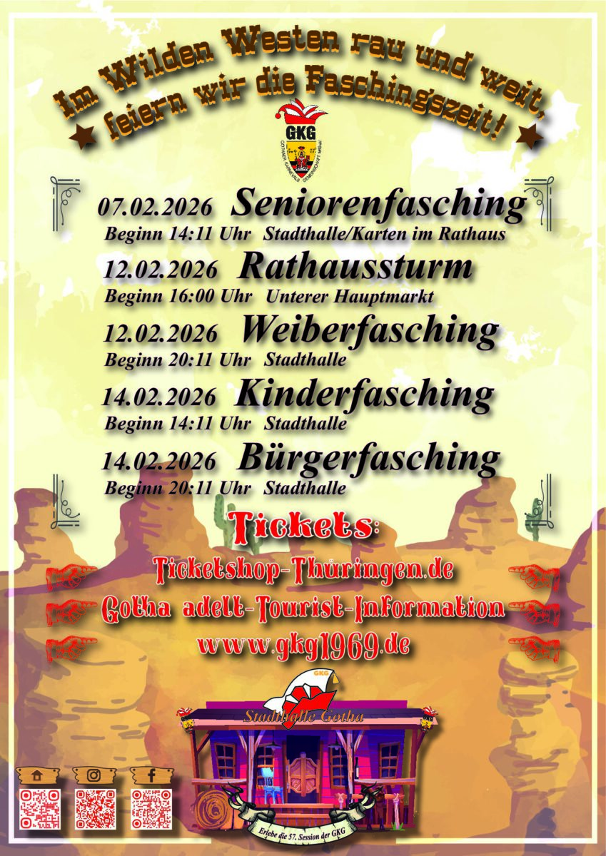 Sattelt die Pferde und haltet die Cowboyhüte fest – der Bürgerfasching in der Stadthalle Gotha lädt ein! Unter dem Motto „Im Wilden Westen rau und weit feiern wir die Faschingszeit“ erwartet euch am 14. Februar 2026 ab 20:11 Uhr ein Abend voller Stimmung, Musik und guter Laune. Kommt vorbei, wenn sich die Stadthalle in einen Saloon verwandelt und wir gemeinsam Fasching wie echte Cowboys und Cowgirls feiern.