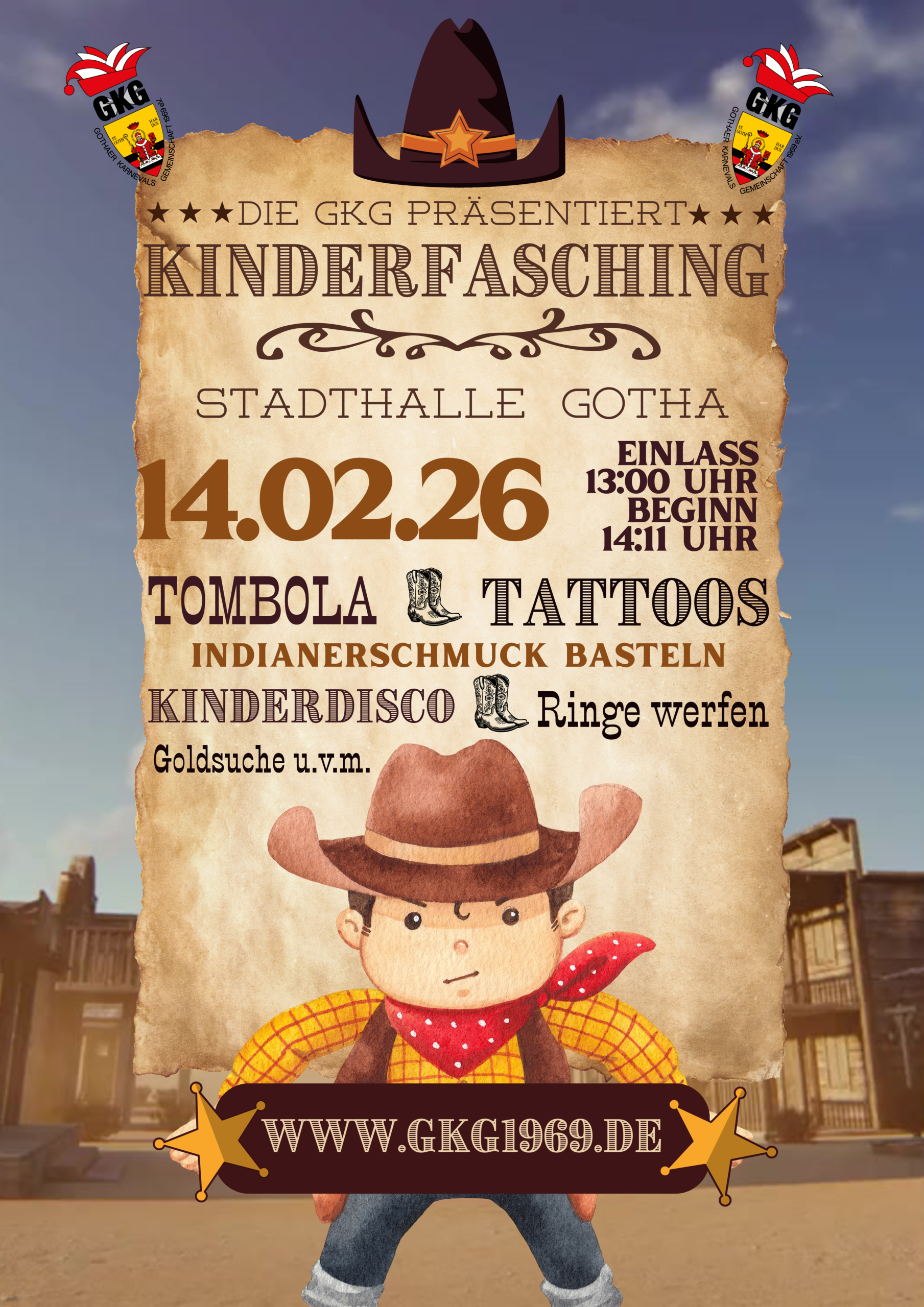Sattelt die Pferde und haltet die Cowboyhüte fest – der Bürgerfasching in der Stadthalle Gotha lädt ein! Unter dem Motto „Im Wilden Westen rau und weit feiern wir die Faschingszeit“ erwartet euch am 14. Februar 2026 ab 20:11 Uhr ein Abend voller Stimmung, Musik und guter Laune. Kommt vorbei, wenn sich die Stadthalle in einen Saloon verwandelt und wir gemeinsam Fasching wie echte Cowboys und Cowgirls feiern!
