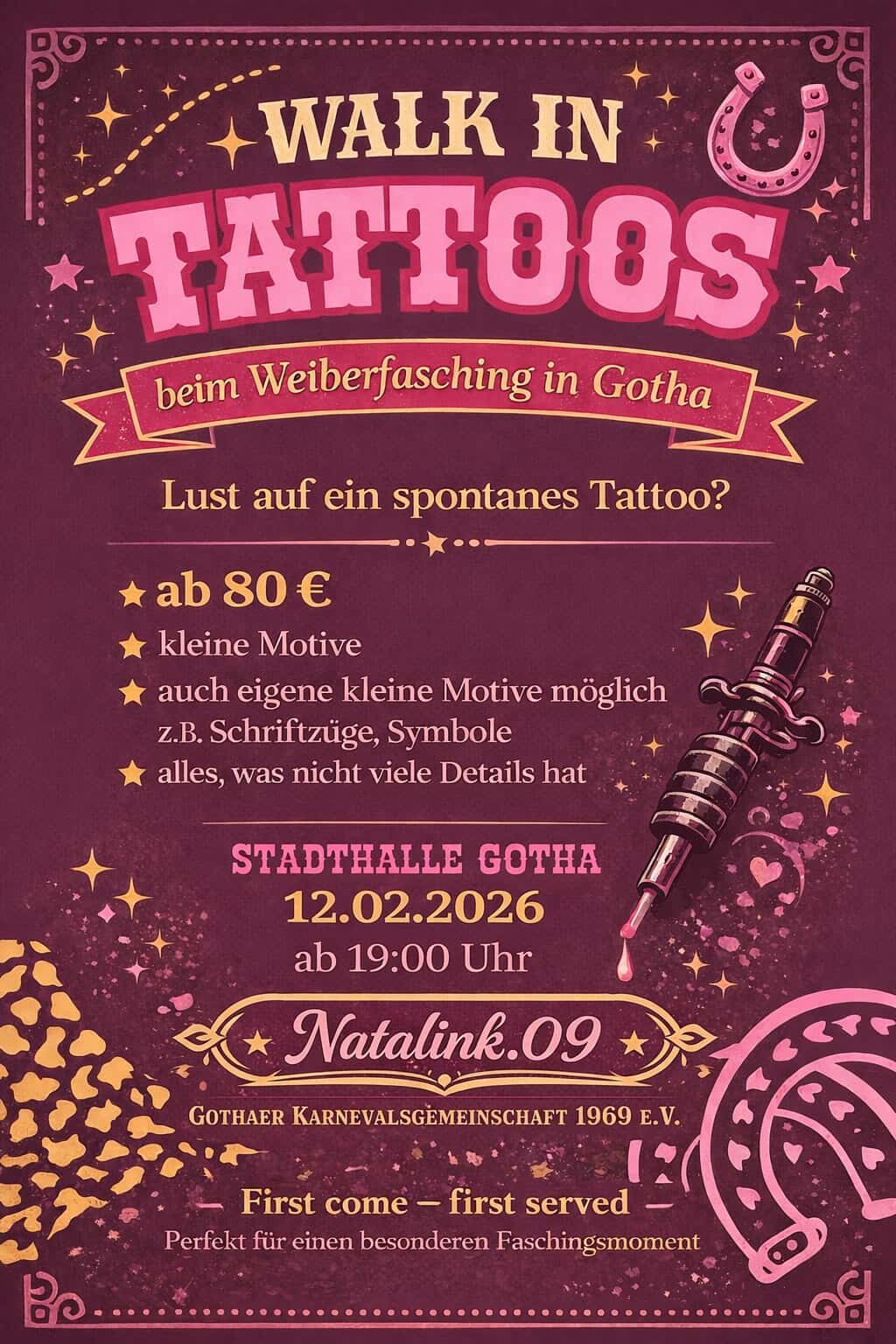 Howdy, Ladies! Am 12. Februar 2026 ab 20:11 Uhr steigt in der Stadthalle Gotha der große Weiberfasching. Unter dem Motto „Wilder Westen“ wird gefeiert, getanzt und gelacht, bis die Stiefel qualmen. Also Cowboyhut auf, Freundinnen schnappen und rein ins bunte Faschingstreiben!